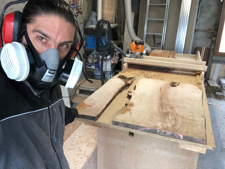 Électricien de carrière, je suis avant tout passionné par le travail du bois, cette matière chaude et vivante aux dessins uniques.